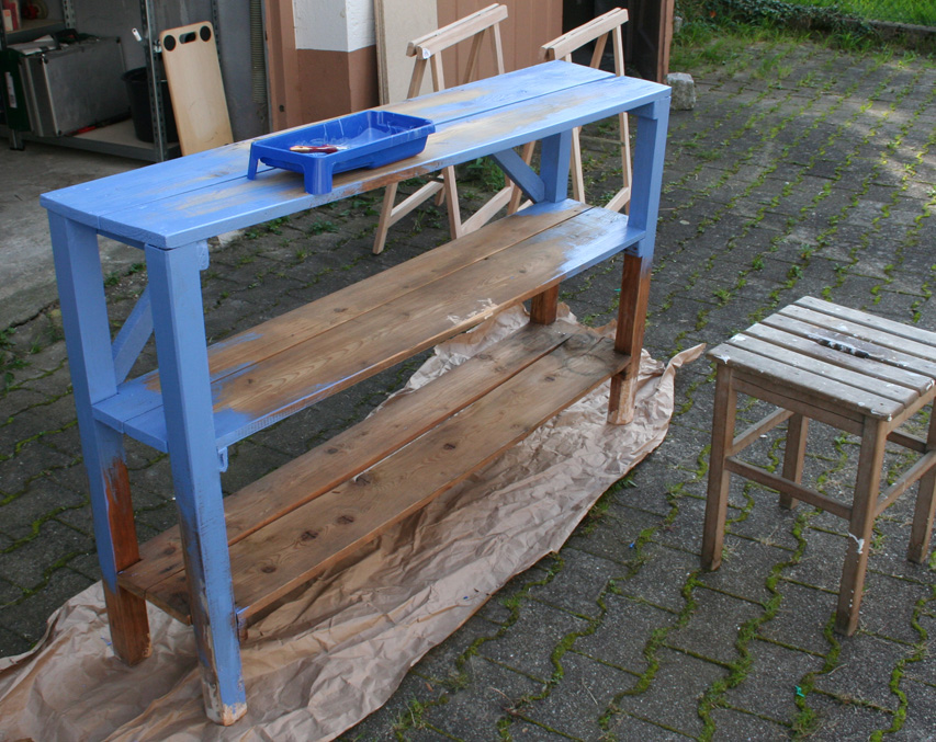 muss man genießen. Anstatt am IMac oder vor der Nähmaschine zu sitzen, gab es heute einen neuen Anstrich für ein Regal – Im Freien und mit einem Funken Hoffnung, das es morgen doch nicht regnen wird.